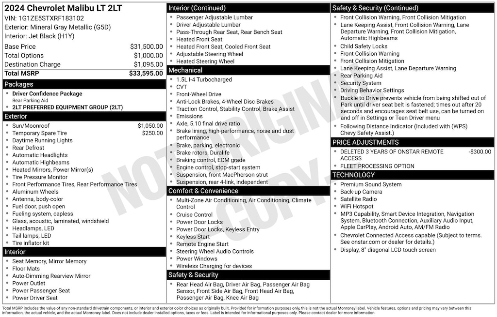 Mineral Gray Metallic 2024 Chevrolet Malibu LT 2LT FWD CVT 1.5L DOHC Jet Black Leather, 19" Aluminum Wheels, 4-Wheel Disc Brakes, 6-Way Power Front Passenger Seat Adjuster, 8-Way Power Driver Seat Adjuster, ABS brakes, Air Conditioning, Auto High-beam Headlights, Auto-dimming Rear-View mirror, Automatic temperature control, Bose Premium 9-Speaker System, Brake assist, Bumpers: body-color, Compass, Delay-off headlights, Driver door bin, Driver Memory, Driver vanity mirror, Dual front impact airbags, Dual front side impact airbags, Electronic Stability Control, Emergency communication system: OnStar and Chevrolet connected services capable, Exterior Parking Camera Rear, Four wheel independent suspension, Front anti-roll bar, Front Bucket Seats, Front Center Armrest, Front dual zone A/C, Front Passenger Power Lumbar Seat Adjuster, Front reading lights, Fully automatic headlights, Heated door mirrors, Heated Driver & Front Passenger Seats, Heated front seats, Heated steering wheel, Illuminated entry, Knee airbag, Leather Shift Knob, Low tire pressure warning, Memory seat, Occupant sensing airbag, Outside temperature display, Overhead airbag, Overhead console, Panic alarm, Passenger door bin, Passenger vanity mirror, Perforated Leather-Appointed Seat Trim, Power door mirrors, Power Driver Lumbar Control Seat Adjuster, Power driver seat, Power passenger seat, Power steering, Power Tilt-Sliding Sunroof, Power windows, Preferred Equipment Group 2LT, Radio: Chevrolet Infotainment 3 Plus System w/Navi, Rear anti-roll bar, Rear reading lights, Rear seat center armrest, Rear side impact airbag, Rear window defroster, Remote keyless entry, Road Emergency Tool Kit, Security system, SiriusXM, Speed control, Split folding rear seat, Steering wheel mounted audio controls, Tachometer, Telescoping steering wheel, Tilt steering wheel, Traction control, Trip computer, USB Charging-Only Port, Variably intermittent wipers, Ventilated Driver & Front Passenger Seats, Ventilated front seats, Voltmeter, Wireless Apple CarPlay/Android Auto.