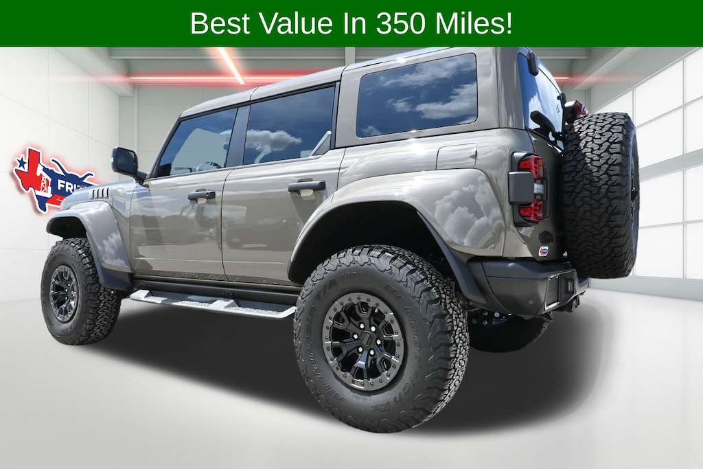 Marsh Gray 2025 Ford Bronco Raptor 4WD 10-Speed Automatic 3.0L EcoBoost V6 4-Wheel Disc Brakes, ABS brakes, Air Conditioning, Auto High-beam Headlights, Auto-dimming Rear-View mirror, Brake assist, Compass, Convertible HardTop, Delay-off headlights, Driver door bin, Driver vanity mirror, Dual front impact airbags, Dual front side impact airbags, Electronic Stability Control, Emergency communication system: 911 Assist, Equipment Group 374A Lux Package, Exterior Parking Camera Rear, Front anti-roll bar, Front Bucket Seats, Front Center Armrest, Front fog lights, Front wheel independent suspension, Fully automatic headlights, Glass rear window, Hard Top Sound Deadening Headliner, Heated door mirrors, Heated steering wheel, Illuminated entry, Integrated roll-over protection, Internet access capable: FordPass Connect, Leather Shift Knob, Leather-Trimmed/Vinyl Bucket Seats, Low tire pressure warning, Occupant sensing airbag, Outside temperature display, Overhead airbag, Overhead console, Passenger door bin, Passenger vanity mirror, Power door mirrors, Power steering, Power windows, Rear anti-roll bar, Rear seat center armrest, Rear window wiper, Security system, SiriusXM w/360L, Speed control, Split folding rear seat, Steering wheel mounted audio controls, Tachometer, Telescoping steering wheel, Tilt steering wheel, Traction control, Trip computer, Turn signal indicator mirrors, Variably intermittent wipers, Voltmeter, Wheels: 17" Black High Gloss-Painted Aluminum.