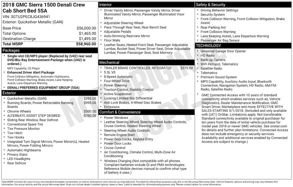 Quicksilver Metallic 2018 GMC Sierra 1500 Denali 4WD 8-Speed Automatic with Overdrive EcoTec3 5.3L V8 8-Speed Automatic with Overdrive, 4WD, Jet Black Leather, 110-Volt AC Power Outlet, 150 Amp Alternator, 1st & 2nd Row Color-Keyed Carpeted Floor Mats, 2-Speed Active Electronic AutoTrac Transfer Case, 3.42 Rear Axle Ratio, 6" Rectangular Chromed Tubular Assist Steps, 8" Multi-Color Customizable Driver Display, Auto-Dimming Inside Rear-View Mirror, Body Color Lower Front Bumper, Body Color Rear Bumper w/Cornersteps, Bose Speaker System, Chrome Bodyside Moldings, Chrome Door Handles, Chrome Mirror Caps, Color-Keyed Carpeting, Deep-Tinted Glass, Driver & Front Passenger Illuminated Vanity Mirrors, Dual-Zone Automatic Climate Control, Electric Rear-Window Defogger, Enhanced Driver Alert Package, EZ Lift & Lower Tailgate, Forward Collision Alert, Front Frame-Mounted Black Recovery Hooks, GMC 4G LTE, GMC Connected Access, Heated & Ventilated Front Bucket Seats, IntelliBeam Automatic High Beam On/Off Headlight, Lane Keep Assist, Leather Wrapped Heated Steering Wheel, Low Speed Forward Automatic Braking, Manual Tilt/Telescoping Steering Column, Navigation System, OnStar & GMC Connected Services Capable, Polished Exhaust Tip, Power Adjustable Pedals, Power Folding & Adjustable Heated Outside Mirrors, Power Sliding Rear Window w/Defogger, Power Windows w/Driver Express Up & Down, Preferred Equipment Group 5SA, Rear 60/40 Folding Bench Seat (Folds Up), Rear Wheelhouse Liners, Remote Keyless Entry, Remote Locking Tailgate, Remote Vehicle Starter System, Single Slot CD/MP3 Player, Steering Wheel Audio Controls, Theft Deterrent System (Unauthorized Entry), Thin Profile LED Fog Lamps, Trailering Equipment, Ultrasonic Front & Rear Park Assist, Universal Home Remote, Wheels: 20" x 9" Bright Machined Aluminum.