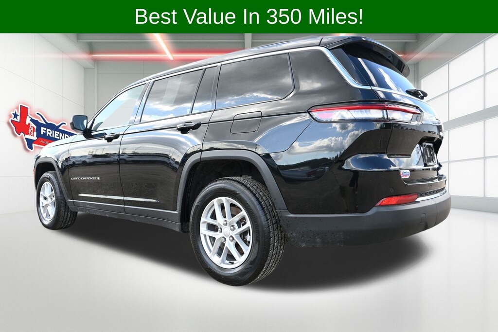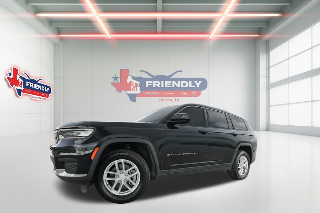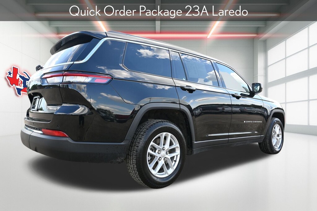 Diamond Black Crystal Pearlcoat 2023 Jeep Grand Cherokee L Laredo RWD 8-Speed Automatic 3.6L V6 24V VVT 3.45 Rear Axle Ratio, 3rd row seats: split-bench, 4-Wheel Disc Brakes, ABS brakes, Anti-whiplash front head restraints, Automatic temperature control, Brake assist, Cloth Seats, Compass, Driver door bin, Driver vanity mirror, Dual front impact airbags, Dual front side impact airbags, Electronic Stability Control, Emergency communication system, Four wheel independent suspension, Front anti-roll bar, Front Bucket Seats, Front Center Armrest w/Storage, Front dual zone A/C, Front reading lights, Fully automatic headlights, Illuminated entry, Knee airbag, Low tire pressure warning, Manual Fold Seatbacks, Molded In Color Black/Gloss Black Roof Rails, Normal Duty Suspension, Occupant sensing airbag, Outside temperature display, Overhead airbag, Overhead console, Panic alarm, ParkView Rear Back-Up Camera, Passenger door bin, Passenger vanity mirror, Power door mirrors, Power driver seat, Power steering, Power windows, Quick Order Package 23A Laredo, Radio: Uconnect 5 w/8.4" Display, Rear air conditioning, Rear anti-roll bar, Rear reading lights, Rear window defroster, Rear window wiper, Remote keyless entry, Security system, Speed control, Speed-Sensitive Wipers, Split folding rear seat, Spoiler, Steering wheel mounted audio controls, Tachometer, Telescoping steering wheel, Tilt steering wheel, Traction control, Trip computer, Variably intermittent wipers, Voltmeter, Wheels: 18" x 8.0" Fully Painted Aluminum.