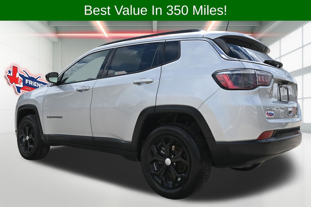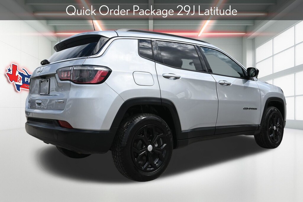 Silver Zynith Metallic Clearcoat 2024 Jeep Compass Latitude 4WD 8-Speed Automatic 2.0L I4 DOHC 4WD, 17" x 7" Aluminum Wheels, 3.73 Final Drive Ratio, 4-Wheel Disc Brakes, ABS brakes, Air Conditioning, Auto High-beam Headlights, Brake assist, Bumpers: body-color, Compass, Delay-off headlights, Driver door bin, Driver vanity mirror, Dual front impact airbags, Dual front side impact airbags, Electronic Stability Control, Emergency communication system: Jeep Connect, Four wheel independent suspension, Front anti-roll bar, Front Bucket Seats, Front Center Armrest w/Storage, Front fog lights, Front reading lights, Fully automatic headlights, Heated door mirrors, Illuminated entry, Knee airbag, Leather Shift Knob, Leather steering wheel, Low tire pressure warning, Occupant sensing airbag, Outside temperature display, Overhead airbag, Overhead console, Panic alarm, ParkView Rear Back-Up Camera, Passenger vanity mirror, Power door mirrors, Power steering, Power windows, Premium Cloth/Vinyl Bucket Seats, Quick Order Package 29J Latitude, Radio: Uconnect 5 w/10.1" Display, Rear anti-roll bar, Rear seat center armrest, Rear window defroster, Rear window wiper, Remote keyless entry, Security system, Speed control, Split folding rear seat, Spoiler, Steering wheel mounted audio controls, Tachometer, Telescoping steering wheel, Tilt steering wheel, Traction control, Trip computer, Variably intermittent wipers.