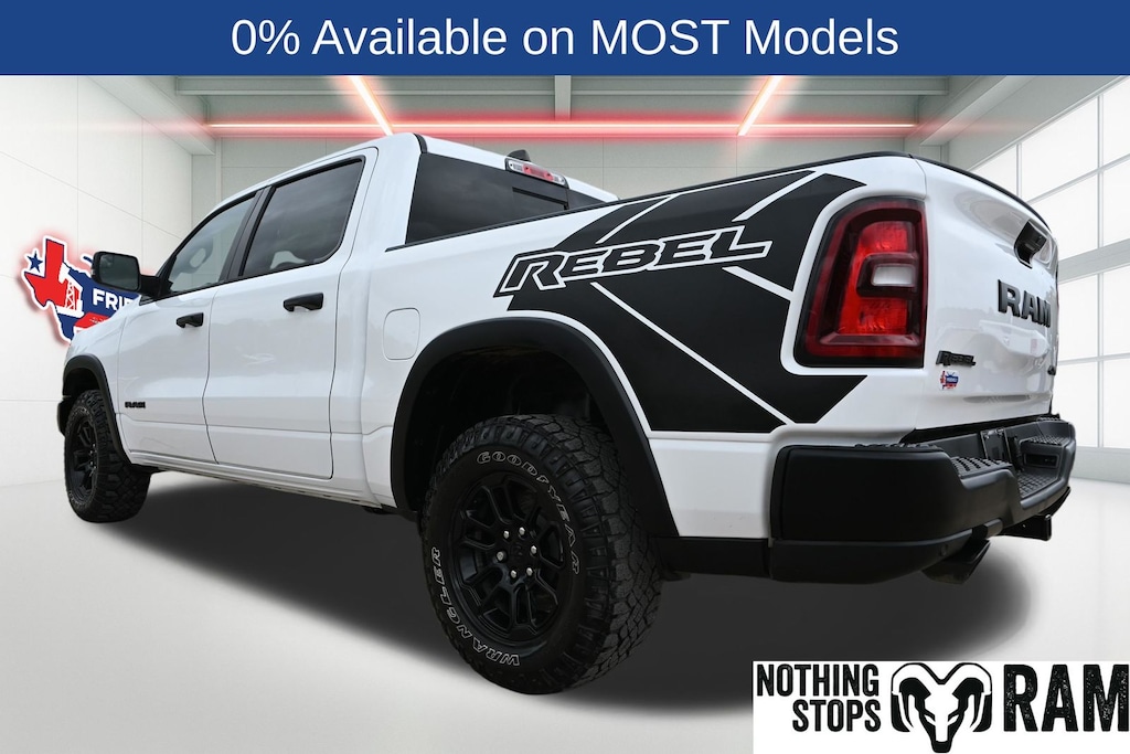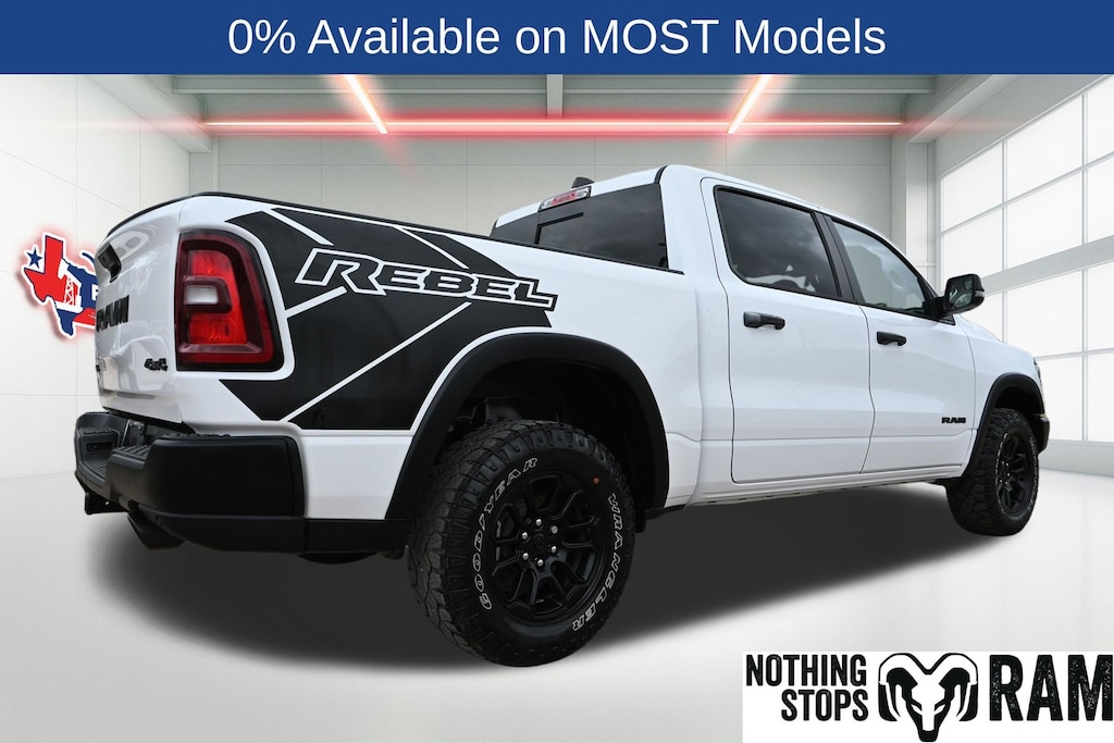 Bright White Clearcoat 2025 Ram 1500 Rebel 4WD 8-Speed Automatic 3.0L I6 10 Speakers, 3.92 Rear Axle Ratio, 4-Wheel Disc Brakes, 4G LTE Wi-Fi Hot Spot, ABS brakes, Auto High-beam Headlights, Auto Power-Folding Mirrors, Auto-Dimming Exterior Driver Mirror, Auto-dimming Rear-View mirror, Automatic temperature control, Black Premium Power Mirrors, Brake assist, Bucket Seats, Compass, Connected Travel & Traffic Services, Convex Wide-Angle Exterior Mirror Insert, Delay-off headlights, Driver door bin, Driver vanity mirror, Dual front impact airbags, Dual front side impact airbags, Electronic Stability Control, Exterior Mirrors Courtesy Lamps, Exterior Mirrors w/Heating Element, Exterior Mirrors w/Supplemental Signals, Front anti-roll bar, Front Bucket Seats, Front Center Armrest w/Storage, Front fog lights, Front reading lights, Front Seat Back Map Pockets, Front wheel independent suspension, Full Length Upgraded Floor Console, Fully automatic headlights, Garage door transmitter, Google Android Auto, GPS Antenna Input, Heated door mirrors, Heated front seats, Heated steering wheel, Illuminated entry, Integrated Voice Command w/Bluetooth, Leather steering wheel, Low tire pressure warning, Manual Folding Exterior Mirrors, Manufacturer's Statement of Origin, Navigation System, Occupant sensing airbag, Outside temperature display, Overhead airbag, Overhead console, Panic alarm, ParkView Rear Back-Up Camera, Passenger vanity mirror, Power Adjust 8-Way Driver Seat, Power Adjustable Pedals, Power door mirrors, Power driver seat, Power steering, Power windows, Quick Order Package 21W Rebel, Radio: Uconnect 5 Nav w/12.0" Display, Rear 60/40 Folding Seat, Rear anti-roll bar, Rear seat center armrest, Rear Window Defroster, Rebel Level 1 Equipment Group, Remote keyless entry, Remote Tailgate Release, Speed control, Steering wheel mounted audio controls, Tachometer, Telescoping steering wheel, Tilt steering wheel, Traction control, USB Host Flip, Variably intermittent wipers, Voltmeter, Wheels: 18" x 8.0" Painted Mid-Gloss Black, Wireless Charging Pad.