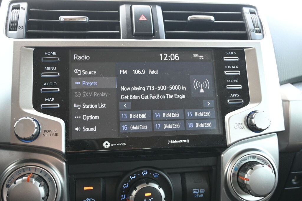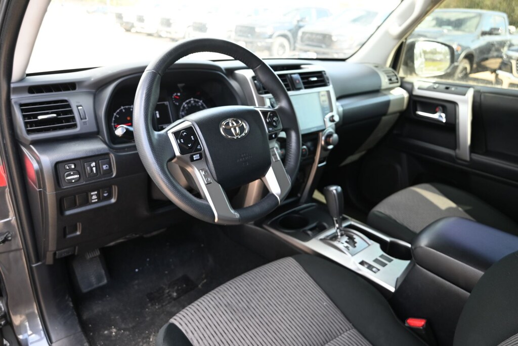 Gray 2023 Toyota 4Runner SR5 RWD 5-Speed with ECT 4.0L V6 DOHC 24V Cloth, 17" 6-Spoke Alloy Wheels, 4-Wheel Disc Brakes, 8 Speakers, ABS brakes, Air Conditioning, Alloy wheels, AM/FM radio: SiriusXM, Apple CarPlay/Android Auto, Auto High-beam Headlights, Bumpers: body-color, Dual front impact airbags, Electronic Stability Control, Exterior Parking Camera Rear, Front Bucket Seats, Front fog lights, Heated door mirrors, Leather Shift Knob, Leather steering wheel, Panic alarm, Power door mirrors, Power driver seat, Power steering, Power windows, Rear window defroster, Rear window wiper, Remote keyless entry, Security system, Speed control, Speed-sensing steering, Spoiler, Steering wheel mounted audio controls, Telescoping steering wheel, Tilt steering wheel, Traction control, Variably intermittent wipers.