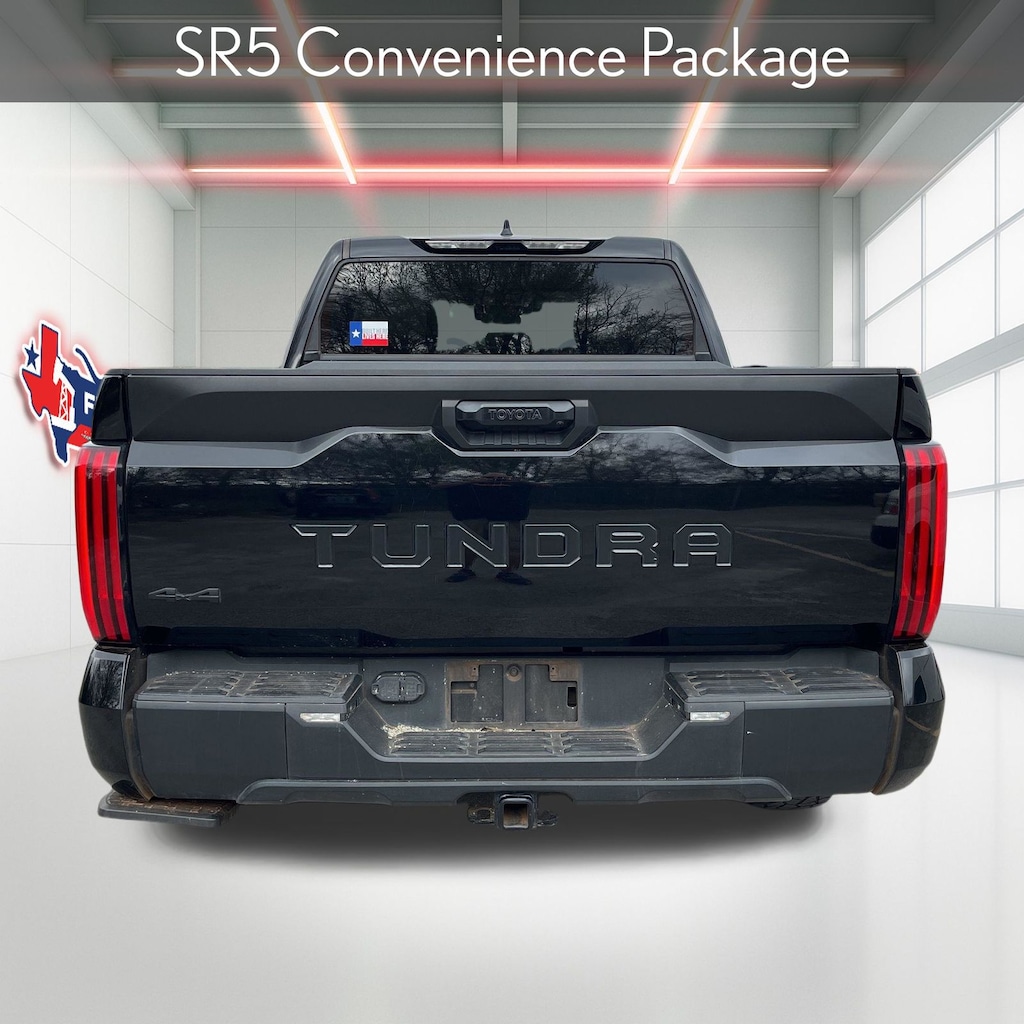 Black 2023 Toyota Tundra SR5 4WD 10-Speed Automatic 3.4L V6 4WD, Boulder Cloth, 18" Alloy Wheels, 3.31 Axle Ratio, 32 Gallon Fuel Tank, 4-Way Adjustable Front Bucket Seats, 4-Wheel Disc Brakes, ABS brakes, AM/FM radio: SiriusXM, Apple CarPlay/Android Auto, Automatic temperature control, Blind Spot Monitor w/Lane Change Assist, Brake assist, Bumpers: body-color, Driver door bin, Driver vanity mirror, Dual front impact airbags, Dual front side impact airbags, Electronic Stability Control, Fabric Seat Trim (FB), Front anti-roll bar, Front Bucket Seats, Front Center Armrest, Front reading lights, Front wheel independent suspension, Fully automatic headlights, Illuminated entry, Knee airbag, Low tire pressure warning, Occupant sensing airbag, Outside temperature display, Overhead airbag, Overhead console, Panic alarm, Parking Support Alert/Brake, Passenger door bin, Passenger vanity mirror, Power steering, Power windows, Rear reading lights, Rear step bumper, Security system, Speed control, Speed-sensing steering, Split folding rear seat, SR5 Convenience Package, Steering wheel mounted audio controls, Tachometer, Telescoping steering wheel, Tilt steering wheel, Traction control, Trip computer, Variably intermittent wipers, Voltmeter.